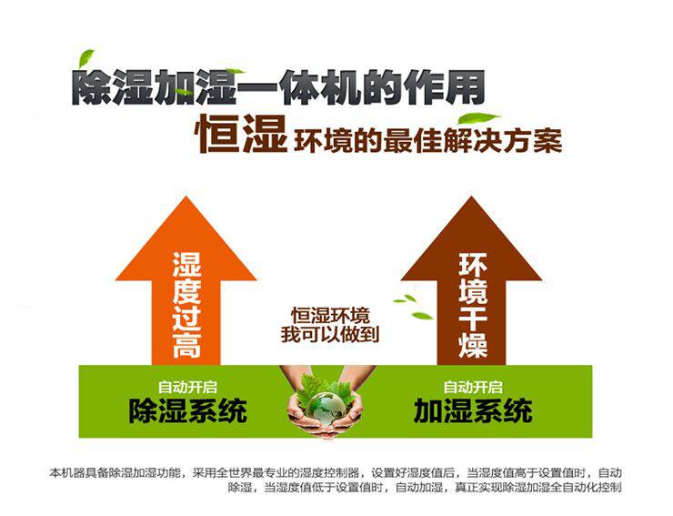 ◎除濕加濕一體機的作用:一臺機器具備除濕功能、加濕功能,設(shè)置好濕度,當(dāng)房間濕度值高于設(shè)置的濕度值時,電腦板控制系統(tǒng)會起動機器除濕功能模塊來進(jìn)行除濕,除濕的水經(jīng)排水管自動排出,達(dá)到設(shè)定的濕度值時會自動停機;當(dāng)干燥天氣,設(shè)定的濕度值低于濕度值時,電腦板控制系統(tǒng)會起動機器加濕功能模塊來進(jìn)行加濕,加濕的水源需連接到機器上,為DN25進(jìn)水管,達(dá)到設(shè)定的濕度值時會自動停機;
